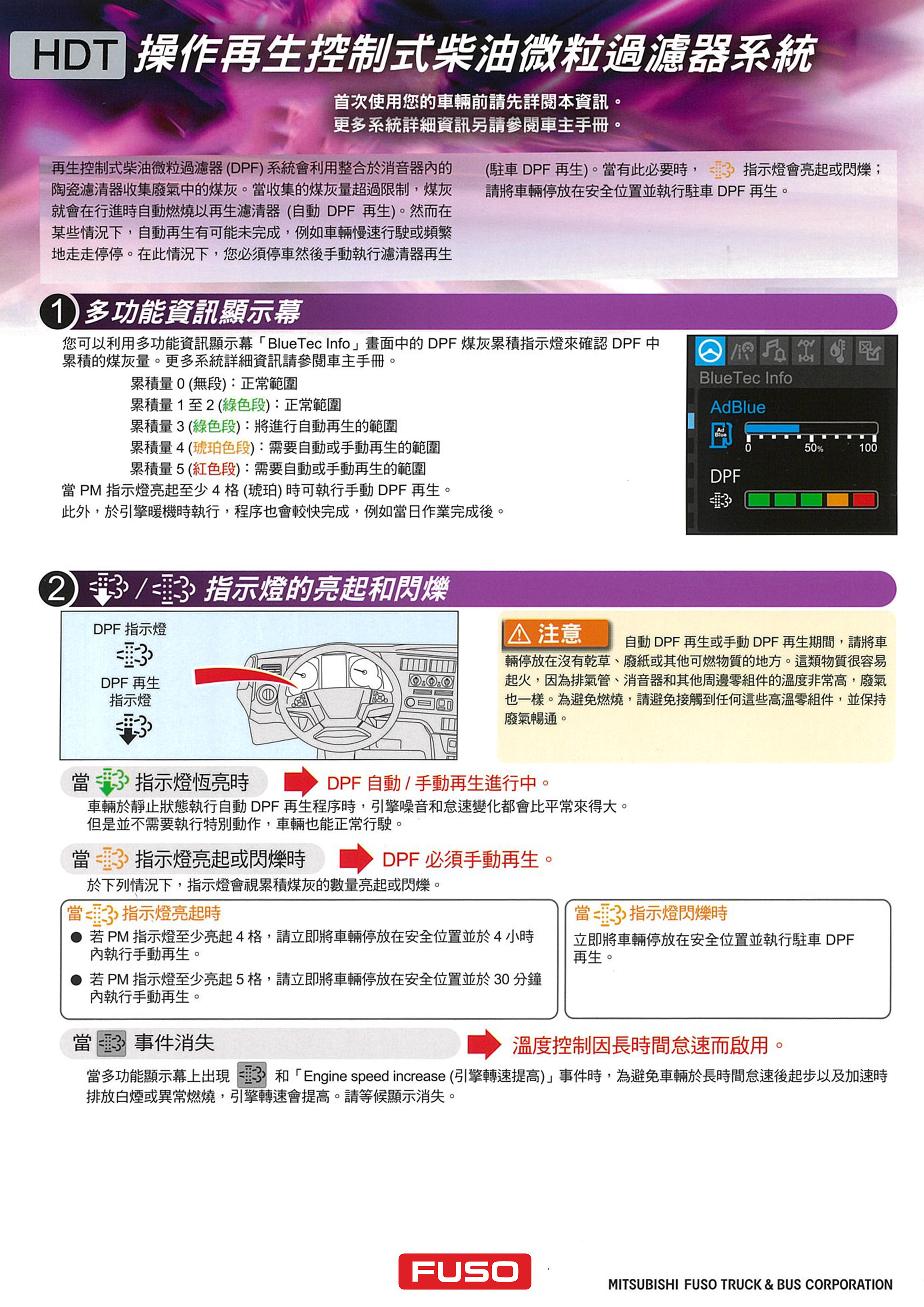 FUSO全新採用德國賓士BlueTec 劃時代的創新技術。使用DPF後處理系統及SCR尿素觸媒還原技術,更能有效地使用燃料,增加輸出馬力,降低排氣污染,更可減少耗油量。滿足歐盟六期廢氣排放法規。
