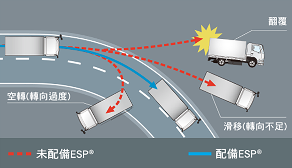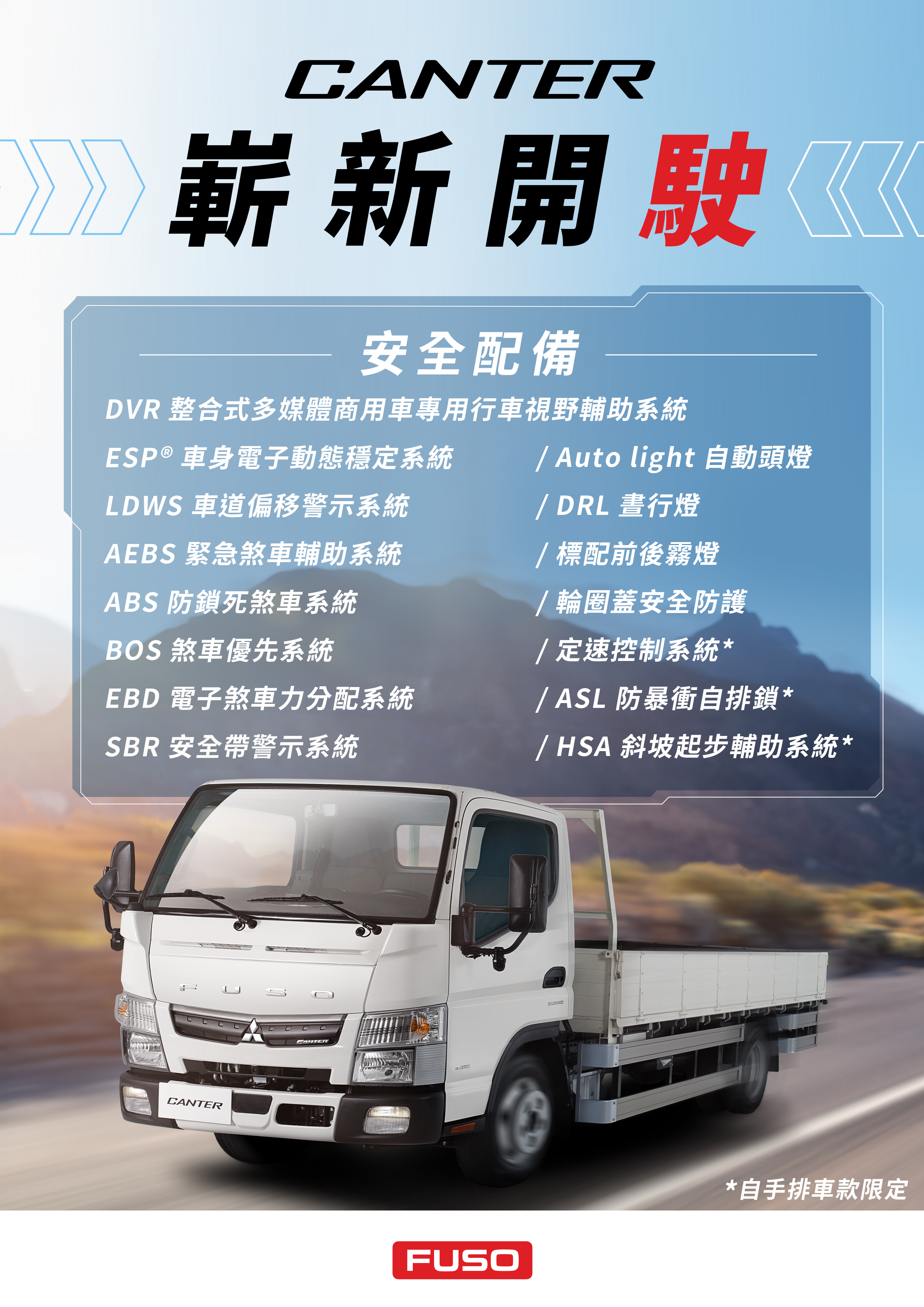 Canter擁有AEB、EBD、BOS、及7吋螢幕整合式行車視野輔助系統提供安全保護,六期新增先進緊急剎車輔助系統(AEBS),可偵測前方行進中車輛、靜止車輛及移動的行人,當偵測到有碰撞的危險時會協助駕駛煞停;車道偏移警示系統(LDWS)會警示提醒駕駛因失神或未預期的車道變換;以及車身電子動態穩定系統(ESP),能提昇車輛的安全性和操縱性,若系統判斷情況危急時,會主動控制引擎和煞車以防止車輛翻覆和滑移。新一代全面的主動式防護科技,當您在商場衝鋒時車輛成為安全可依靠移動堡壘。