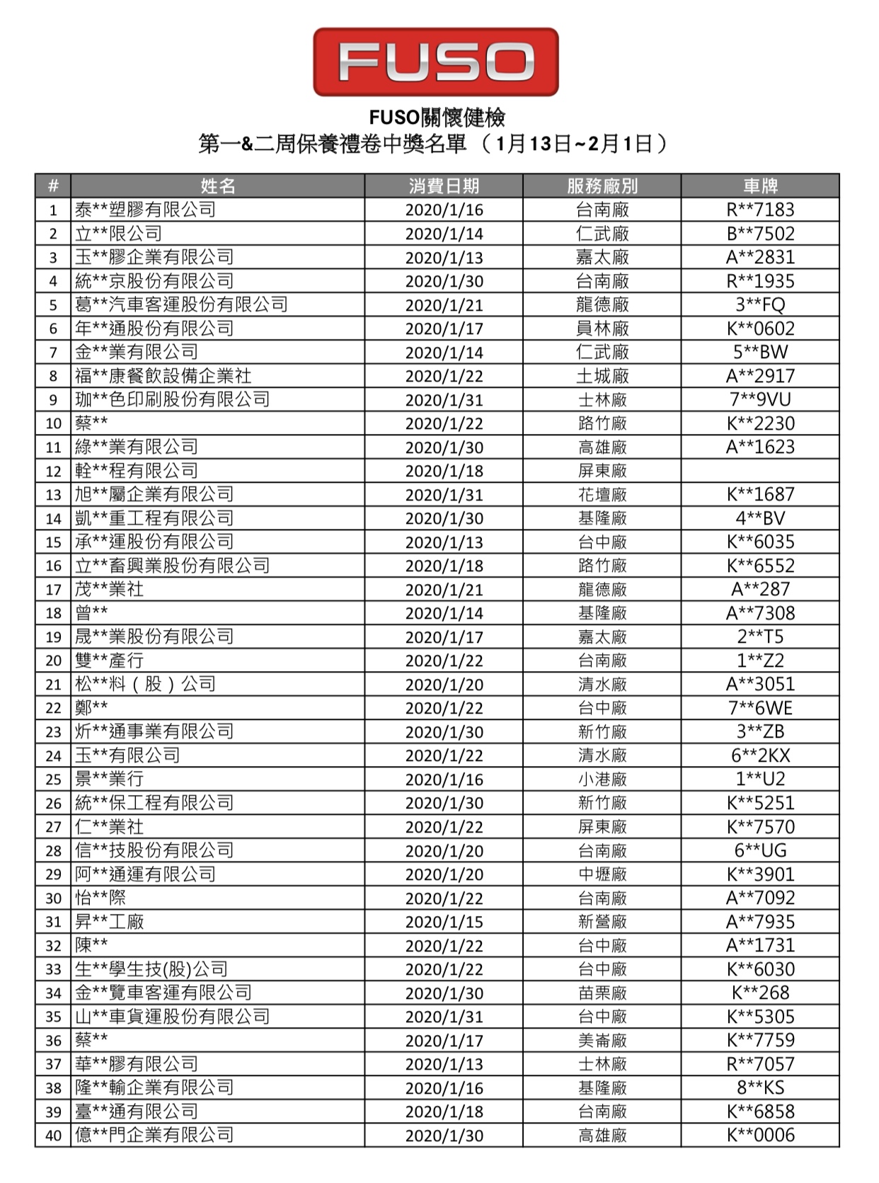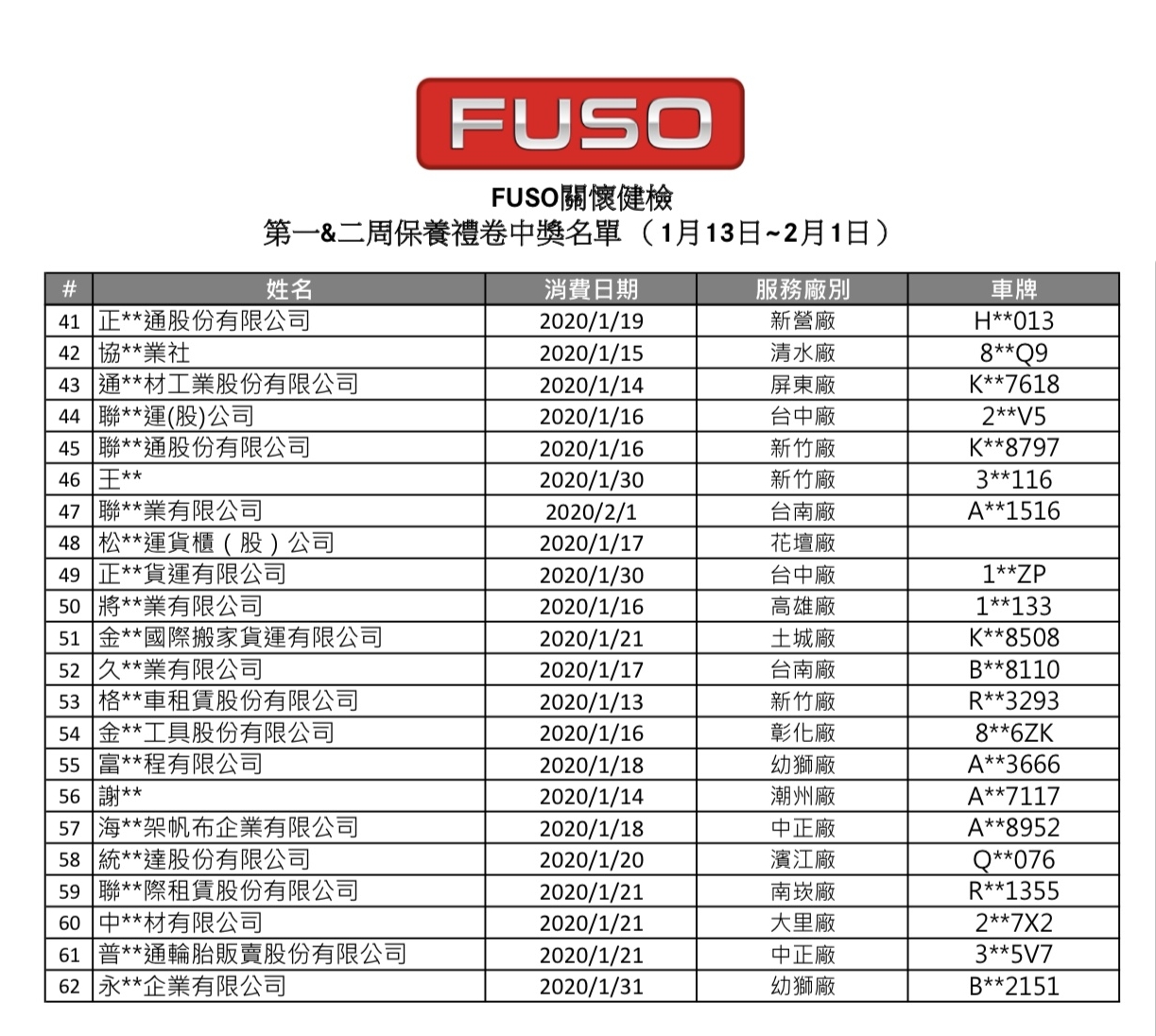 第一波中獎【2020/1/13到2020/2/1進廠消費】得獎名單 恭喜幸運的車主各獲得【原廠保養禮券$8000元】中獎名單如下,各區專責人員將會聯絡各位得獎者處理後續中獎事宜。 依所得稅法規定,機會中獎或競賽得獎之獎項價值若超過NT$1,000,將依規定開立扣繳憑單 (但免扣繳),併入個人當年度綜合所得稅所得中計算所得稅;若獎品價值總額超過NT$20,000,須代扣10%中獎獎金稅額。