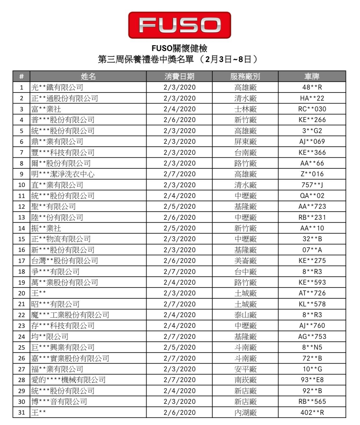 第二波中獎【2020/2/3到2020/2/8進廠消費】得獎名單 恭喜 第二波 幸運的車主各獲得【原廠保養禮券$8000元】中獎名單如下,各區專責人員將會聯絡各位得獎者處理後續中獎事宜。 依所得稅法規定,機會中獎或競賽得獎之獎項價值若超過NT$1,000,將依規定開立扣繳憑單 (但免扣繳),併入個人當年度綜合所得稅所得中計算所得稅;若獎品價值總額超過NT$20,000,須代扣10%中獎獎金稅額。