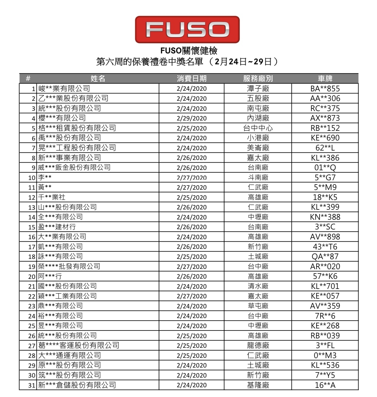 恭喜 第五波 幸運的車主各獲得【原廠保養禮券$8000元】中獎名單如下,各區專責人員將會聯絡各位得獎者處理後續中獎事宜。本次【FUSO全車系免費健診 滿額抽FUSO保養劵活動】已圓滿落幕,感謝各位車主對FUSO的支持!