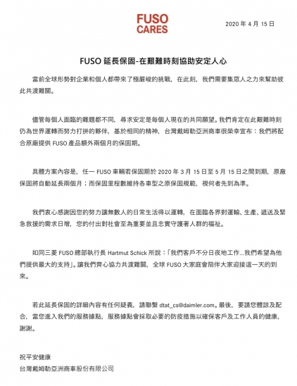 當前全球形勢對企業和個人都帶來了極嚴峻的挑戰,在此刻,我們需要集眾人之力來幫助彼此共渡難關。儘管每個人面臨的難題都不同,尋求安定是每個人現在的共同願望。我們肯定在此艱難時刻仍為世界運轉而努力打拼的夥伴,基於相同的精神,台灣戴姆勒亞洲商車很榮幸宣布:我們將配合原廠提供FUSO產品額外兩個月的保固期。
