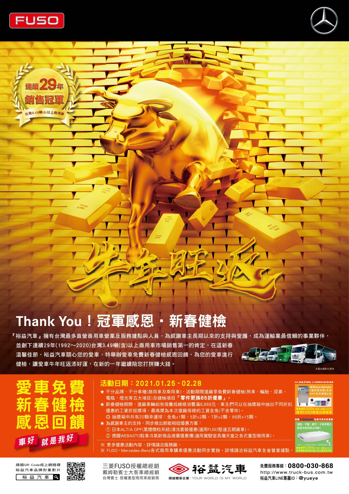 為感謝車主長期以來的支持與愛護,成為運輸業最信賴的事業夥伴, 並創下連續29年(1992~2020)台灣3.49噸(含)以上商用車市場銷售第一。 裕益汽車關心您的愛車,特舉辦愛車免費新春健檢感恩回饋,為您的愛車進行健檢。