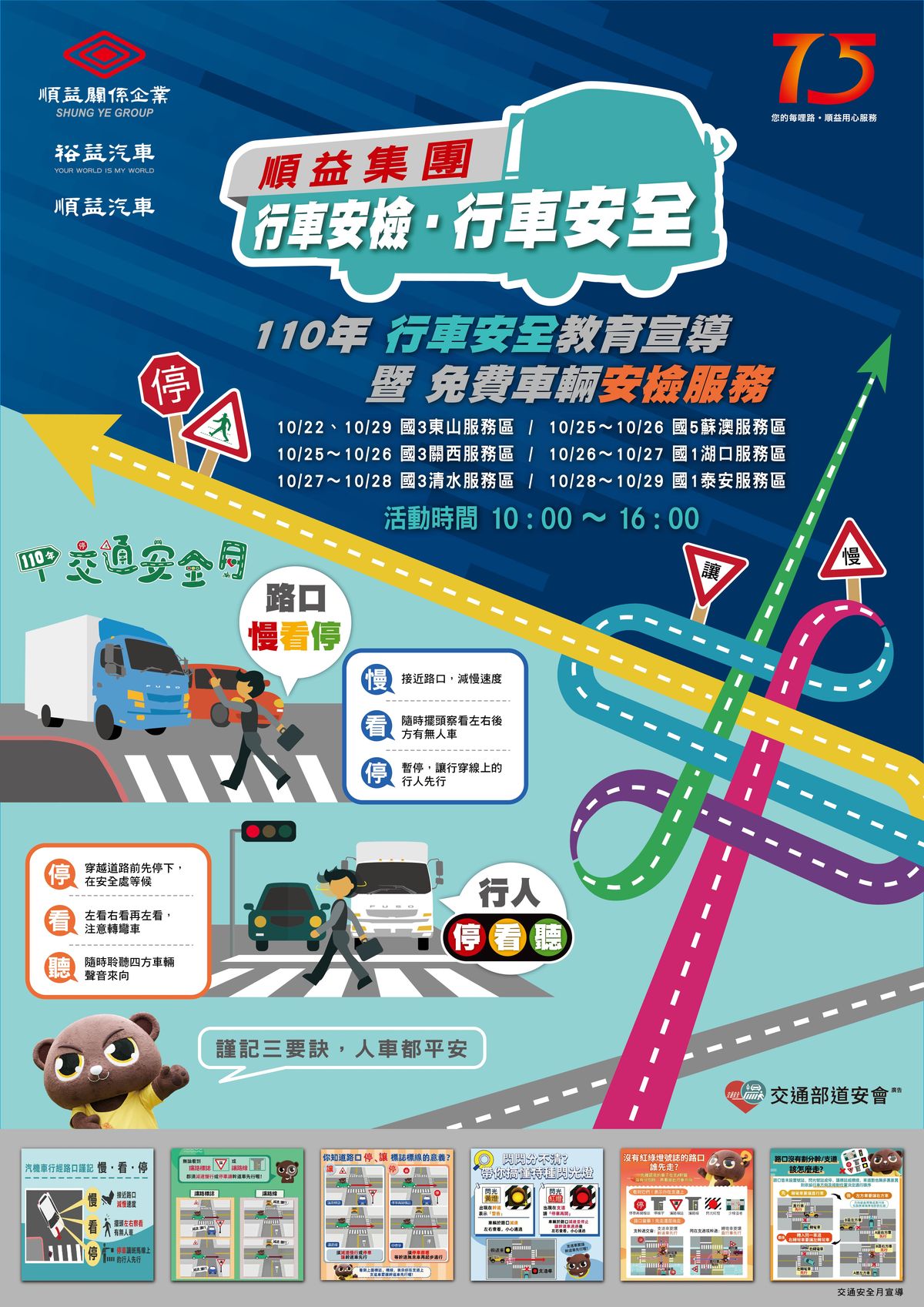 110年為『順益集團』創業75週年,為響應交通部110年10月之交通安全月主軸-路口安全「路口慢看停 行人停看聽」活動,以『順益集團』為主辦單位(旗下商用車事業體-裕益汽車股份有限公司及乘用車事業體-順益汽車股份有限公司為執行單位),由交通部 道路交通安全督導委員會擔任指導單位,並在協辦單位交通部高速公路局協助下,於10/22~10/29在國道高速公路主要服務區擴大辦理『順益集團「行車安檢‧行車安全」110年行車安全教育宣導暨免費車輛安檢服務』,藉此服務更多車輛推廣行車安檢及提升行車安全,喚起國人對道路交通安全意識,強化路口安全與行車安全認知與行為。