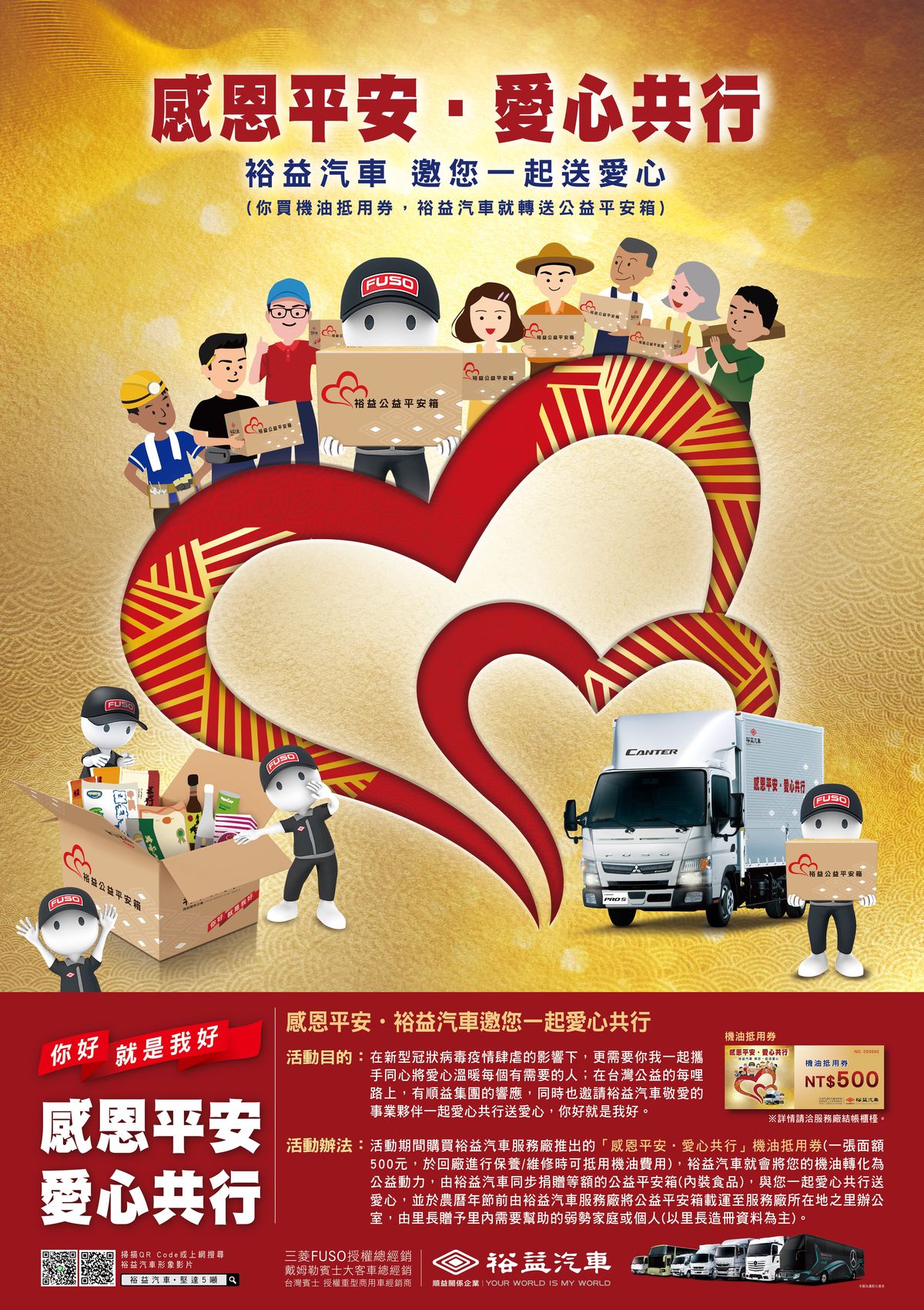 在新型冠狀病毒疫情肆虐的影響下,更需要你我一起攜手同心將愛心溫暖每個有需要的人;在台灣公益的每哩路上,有順益集團的響應,同時也規劃邀請裕益汽車敬愛的事業夥伴一起愛心共行送愛心,你好就是我好。 ※活動詳情請洽服務廠結帳櫃台※