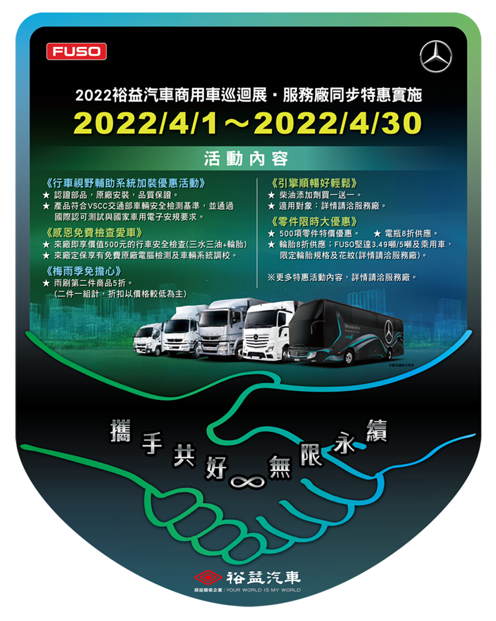 唯有裕益,才能超越裕益,在全新改款FUSO、Mercedes-Benz六期商用車上市之際,我們特舉辦商用車巡迴展, 將來自德國戴姆勒集團環保省油、耐用高效率,引領世界車輛安全標準的高科技商用車導入台灣, 滿足您多元化的載運需求與您「攜手共好‧無限永續」,誠摯歡迎各位敬愛的事業夥伴們攜家帶眷逗陣來看好車、拿好禮、享美食! ※各式商用車購車特惠、服務廠保養/維修、零件同步優惠活動實施,詳情請洽裕益汽車營業/服務據點。