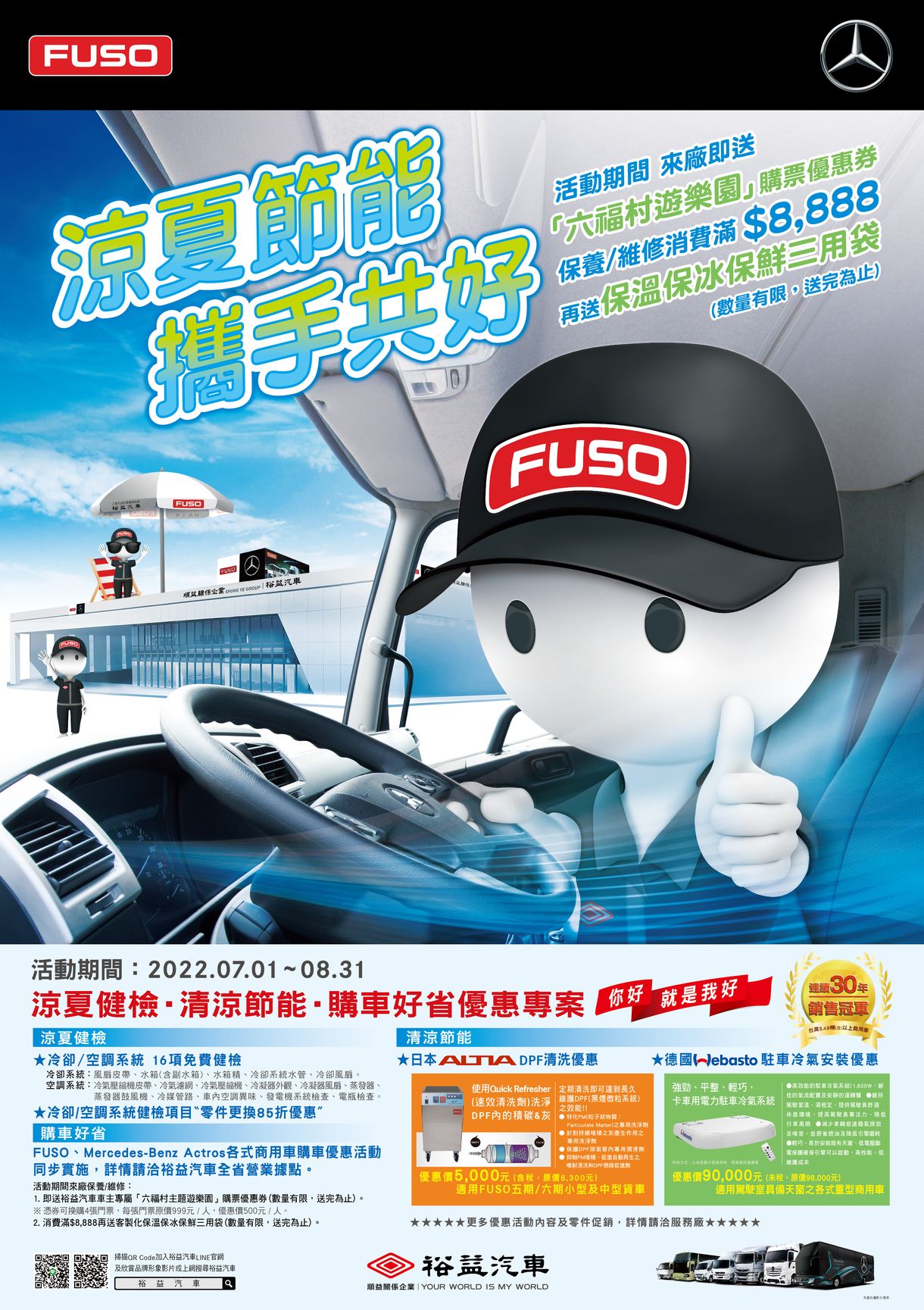 活動期間來廠保養/維修即送「六福村遊樂園」購票優惠券,消費滿$8,888 再送保溫保冰保鮮三用袋(數量有限,送完為止)。 ※涼夏冷卻/空調免費健檢、DPF清洗/駐車冷氣安裝優惠、購車好省優惠專案施實,更多優惠活動內容,詳情請洽裕益汽車營業/服務據點。