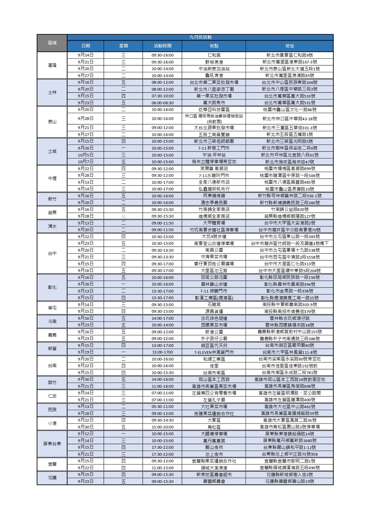 ,詳細日期與地點請參考下表