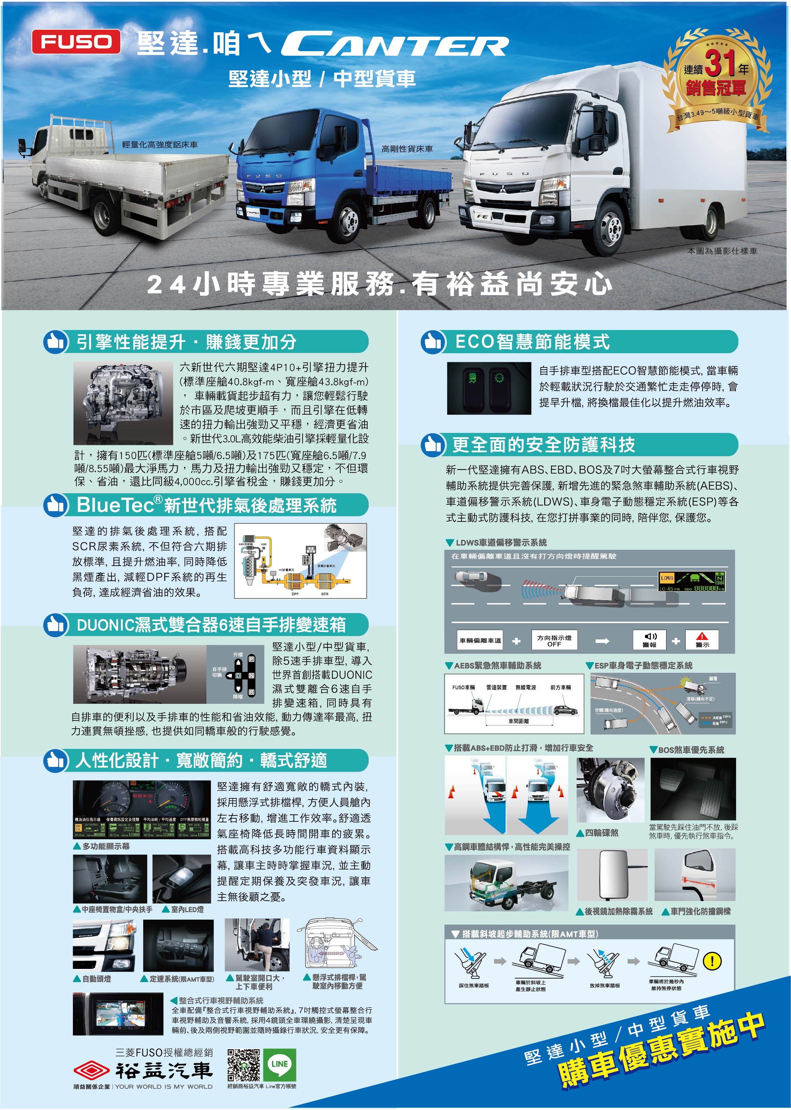 鬥陣打拼、載重有力、耐操好用,堅達‧咱ㄟCanter 24小時專業服務.有裕益尚安心 歡慶FUSO Canter 60年, 即日起訂購Canter 5噸小貨車,並在6月30日前完成領牌, 送5萬公里(5次)原廠零件免費全車保養、2萬元中油柴油加油金。 舊換新再加碼1萬購車金。 詳情請洽裕益汽車全台營業據點。 ※裕益汽車保留專案優惠辦法變更及解釋之權利。