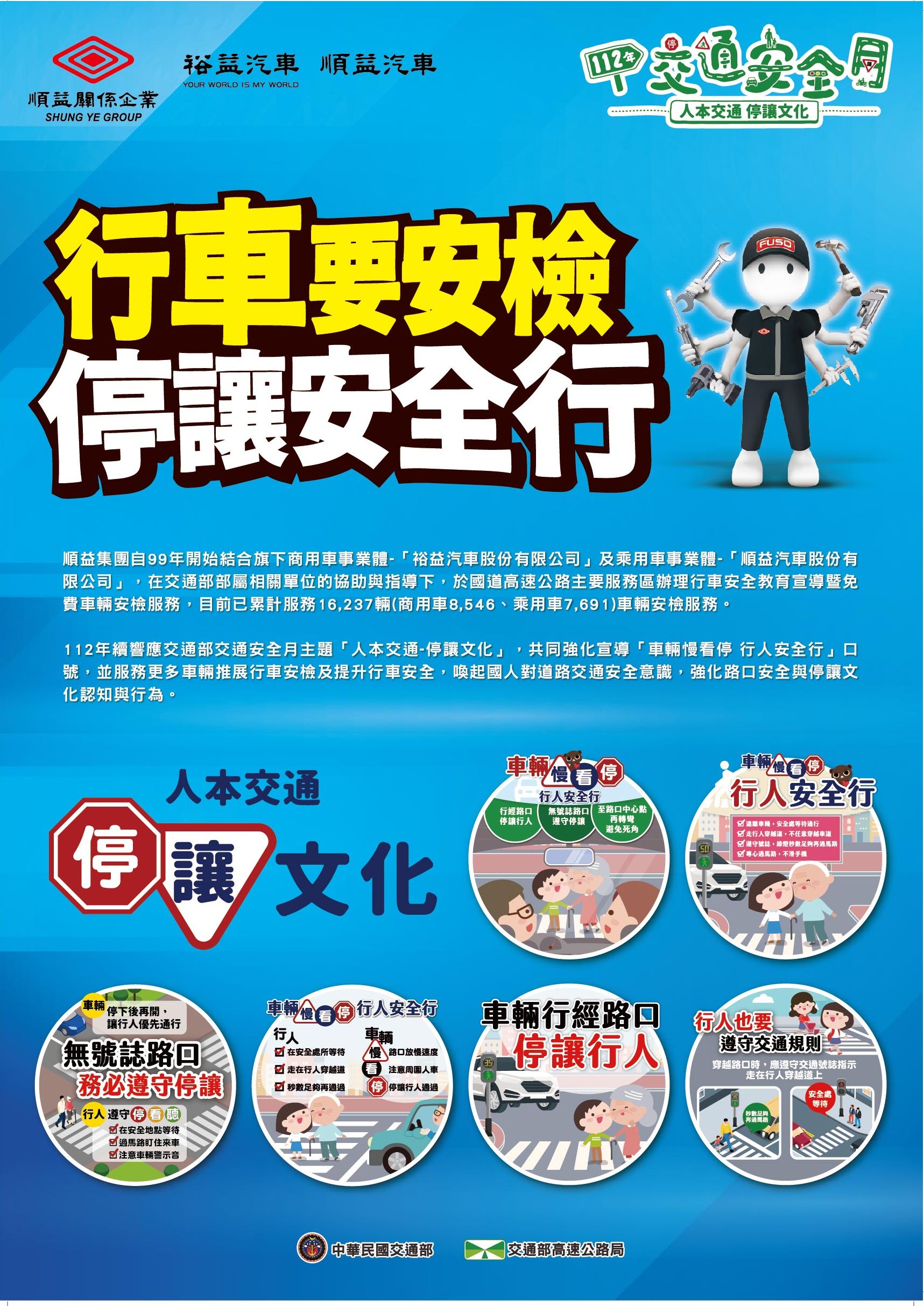 112年續響應交通部交通安全月主題「人本交通-停讓文化」,共同強化宣傳「車輛慢看停 行人安全行」口號,並服務更多車輛推展行車安檢及提升行車安全,喚起國人對道路交通安全意識,強化路口安全與停讓文化認知與行為。『順益集團』為主辦單位(旗下商用車事業體-裕益汽車股份有限公司及乘用車事業體-順益汽車股份有限公司為執行單位),由交通部道路交通安全督導委員會及交通部公路總局擔任指導單位,並在協辦單位交通部高速公路局協助下,將於09/17~09/27在國道高速公路10個主要服務區辦理『順益集團「行車要安檢‧禮讓安全行」112年行車安全教育宣導暨免費車輛安檢服務』。
