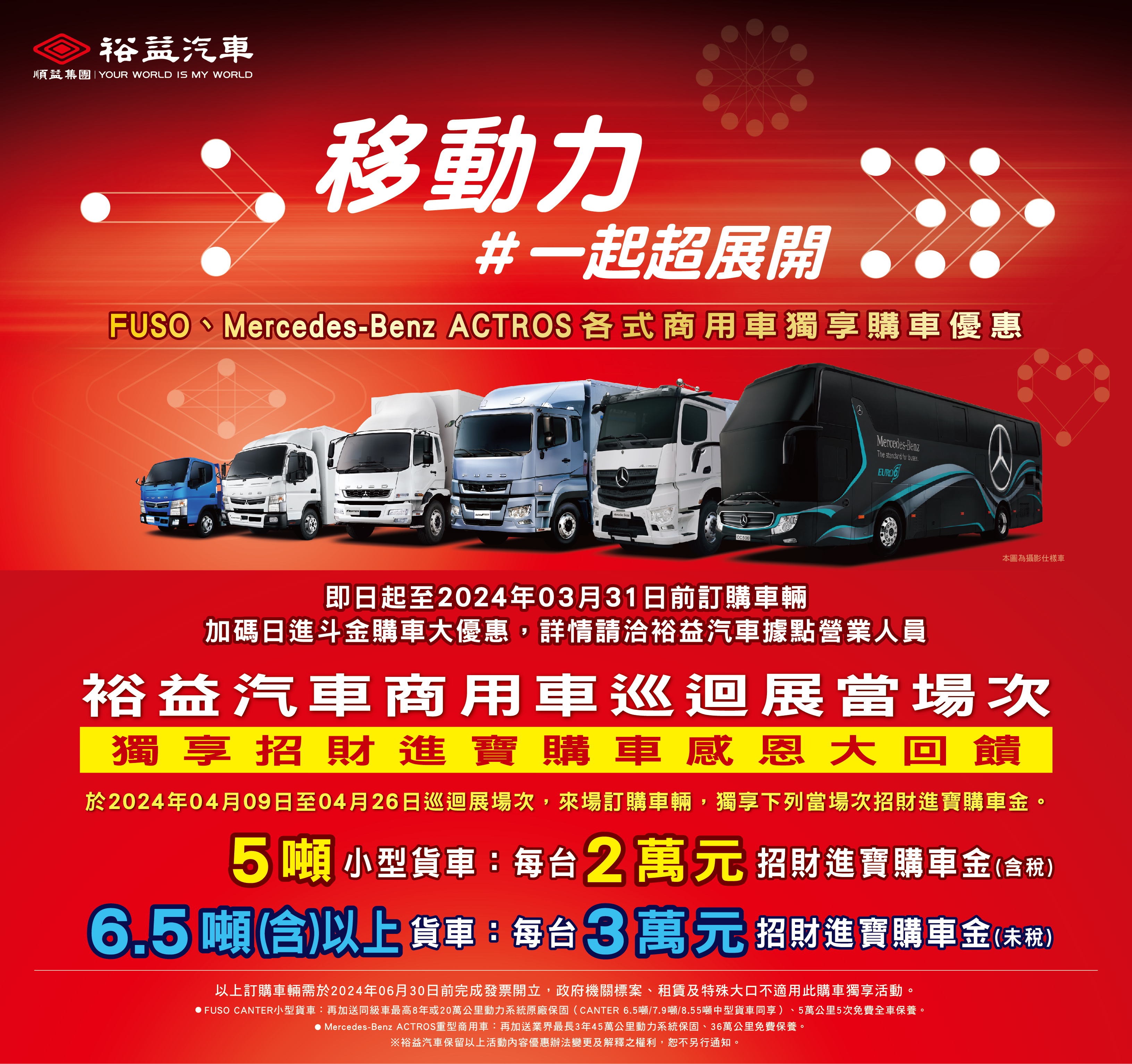 現在買「FUSO、Mercedes-Benz ACTROS各式商用車」享最高3萬元購車金優惠!