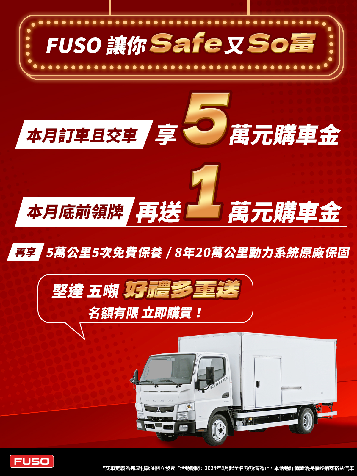把握機會,立即行動!Canter 五噸,豪禮大放送! 購車金: 本月底前交車/收單,即享5萬元購車金。 加碼禮: 本月底前領牌,再享加碼1萬元購車金。 保養無憂: 5萬公里內 (共5次) 免費全車保養。 安心保固: 8年/20萬公里動力系統原廠保固。 * 活動期間: 2024年8月起至名額額滿為止。詳細資訊,請洽授權經銷商裕益汽車。 * 交車定義為完成付款並開立發票。