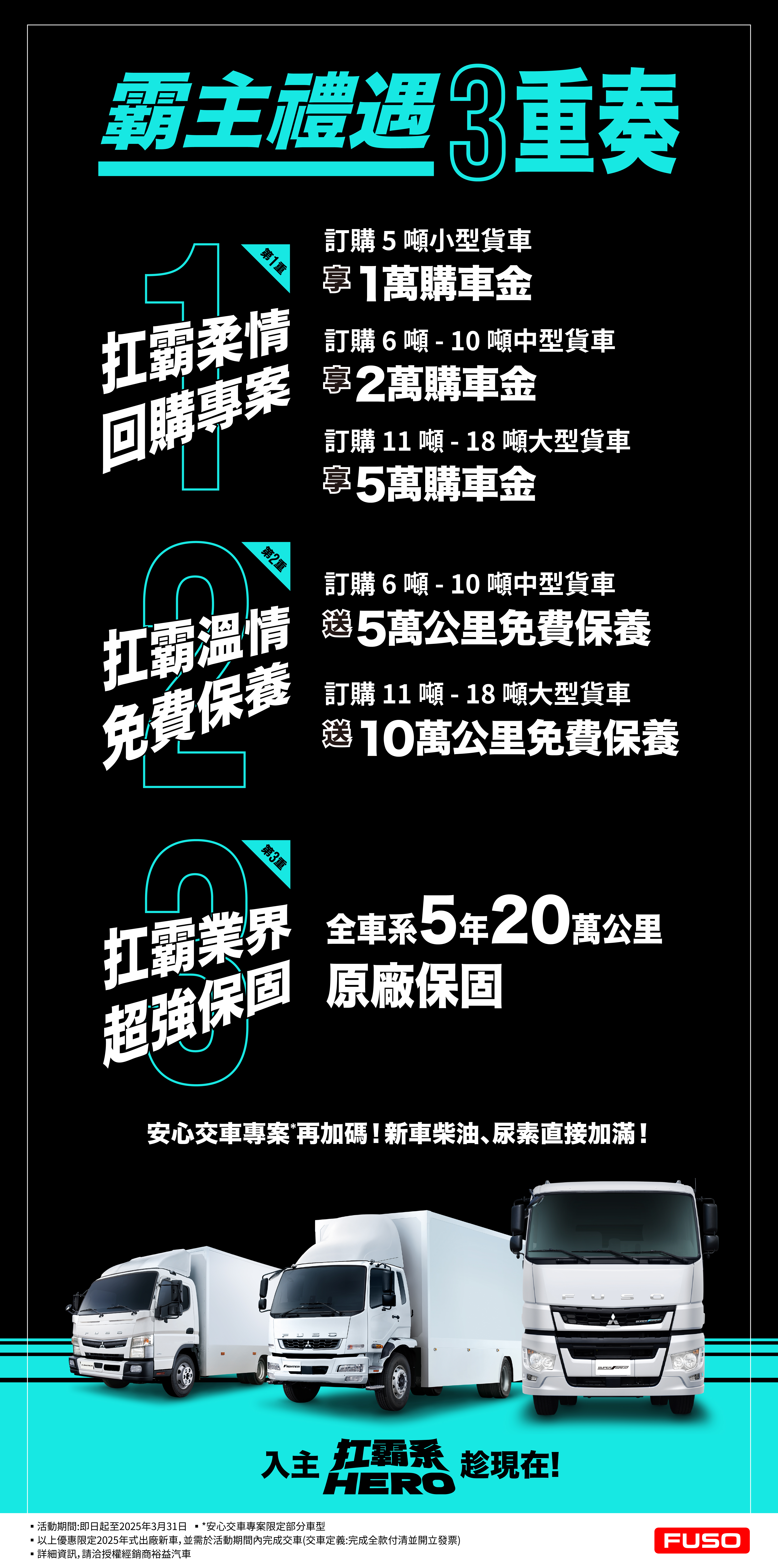 - 買 11 噸 - 18 噸大型貨車:送 10 萬公里免費保養