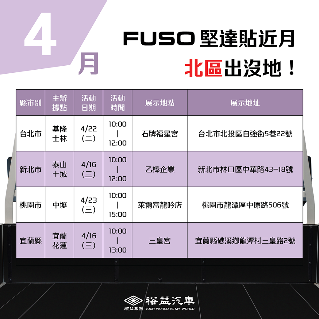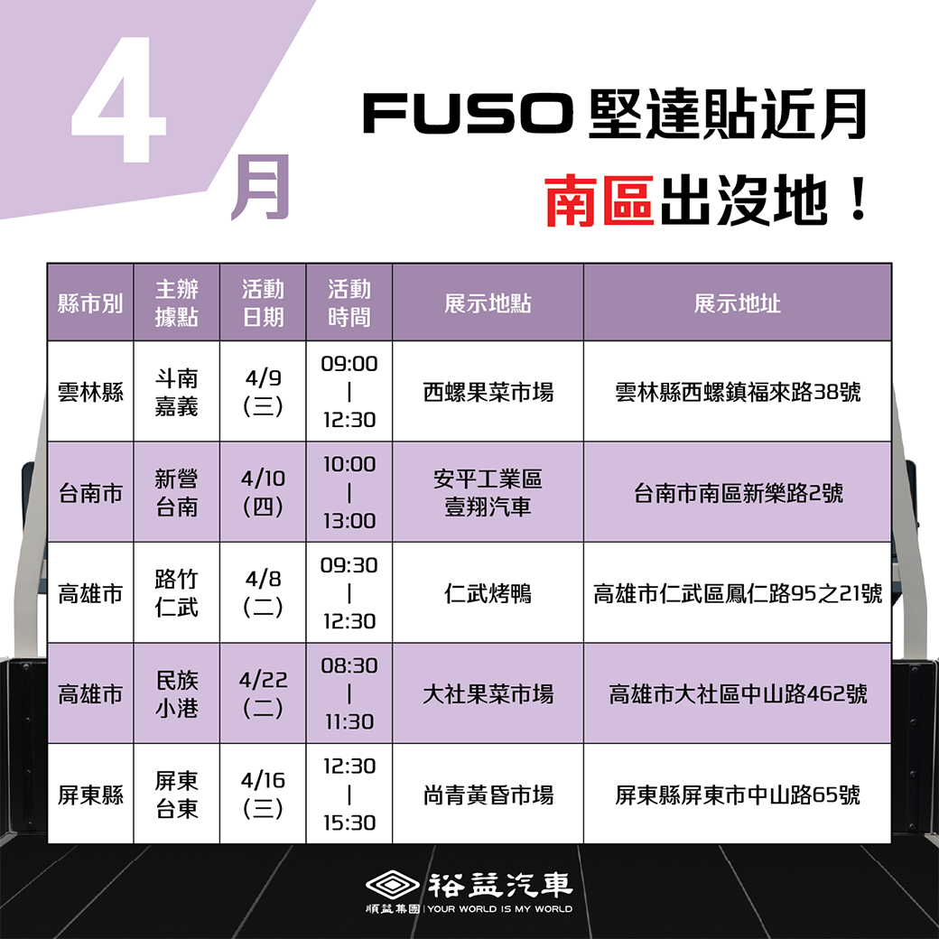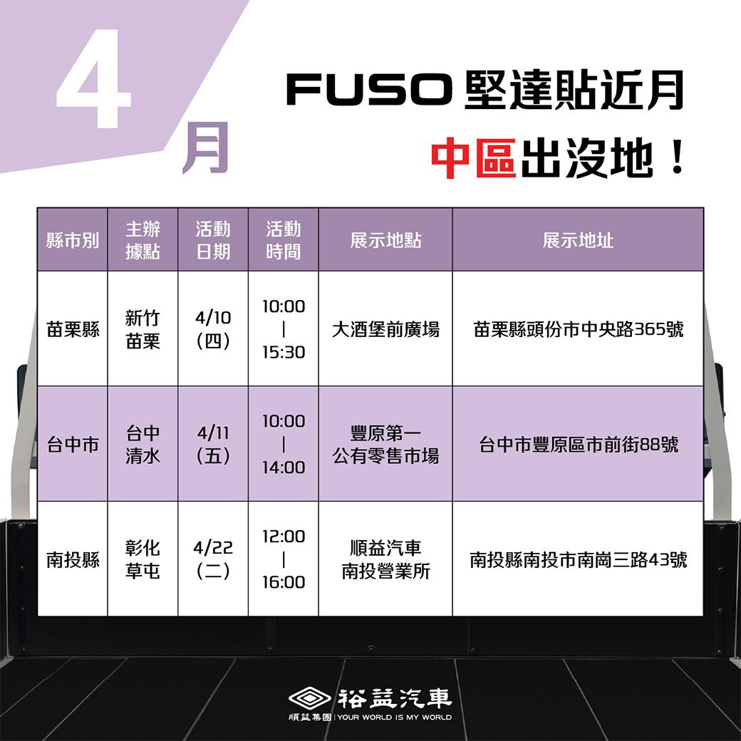 頭家朋友們,科技在進步,賺錢的貨車也要跟著進步,賺錢才會多又快! 邀請您來體驗FUSO堅達的最新高科技、大器又舒適的內裝,我們把FUSO堅達5噸貨車開到您面前,讓頭家朋友們可以近距離體驗它的好開、有力、舒適及高科技! 歡迎大家靠過來,親身感受,各場次詳細資訊,請詳見下方表格。 裕益汽車保留變更、取消活動內容及辦法的權利,並保有最終解釋權。場次表僅供參考,實際活動將以裕益汽車官網公告為主,或致電主辦據點洽詢。
