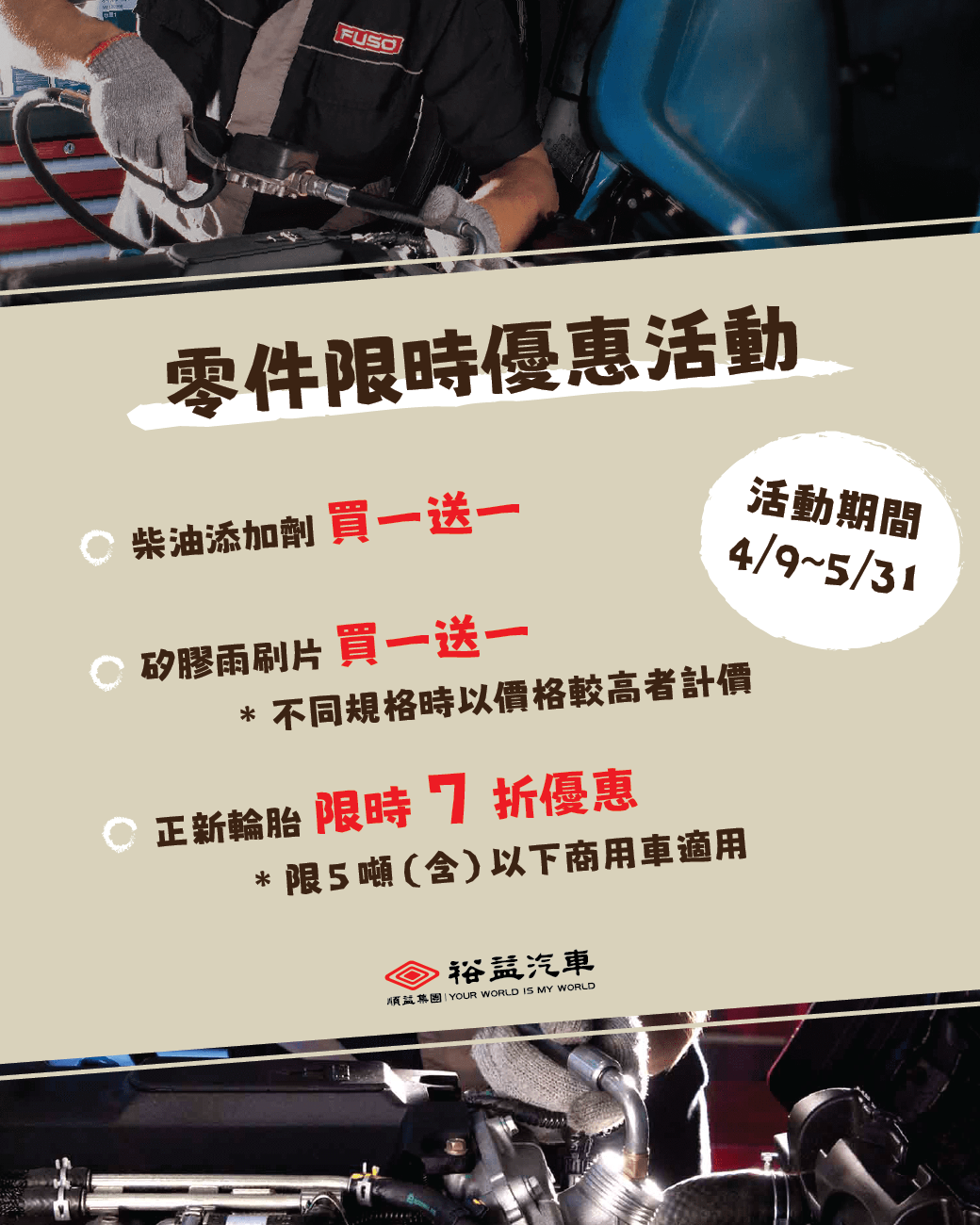 而在每個服務廠,我們也推出限定優惠,歡迎各位運將朋友、頭家闆娘開著你的愛車回娘家,好好檢查你的賺錢夥伴,也享受我們為你準備的限時優惠。
