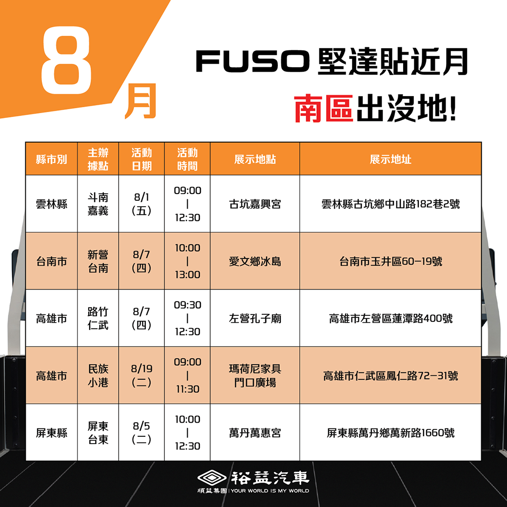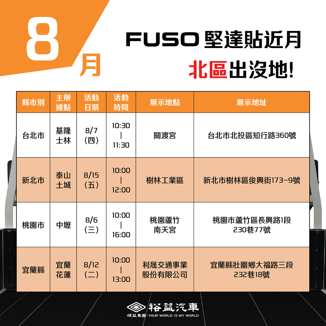 頭家朋友們,科技在進步,賺錢的貨車也要跟著進步,賺錢才會多又快! 邀請您來體驗FUSO堅達的最新高科技、大器又舒適的內裝,我們把FUSO堅達5噸貨車開到您面前,讓頭家朋友們可以近距離體驗它的好開、有力、舒適及高科技! 歡迎大家靠過來,親身感受,各場次詳細資訊,請詳見下方表格: 活動調整公告 因受颱風影響,部分外展時間更動如下: 中區:原8/13(三)源昌汽車貨運行展示試乘(主辦據點:彰化草屯),將延期舉辦,確切時間將另行公告。 裕益汽車保留變更、取消活動內容及辦法的權利,並保有最終解釋權。場次表僅供參考,實際活動將以裕益汽車官網公告為主,或致電主辦據點洽詢。