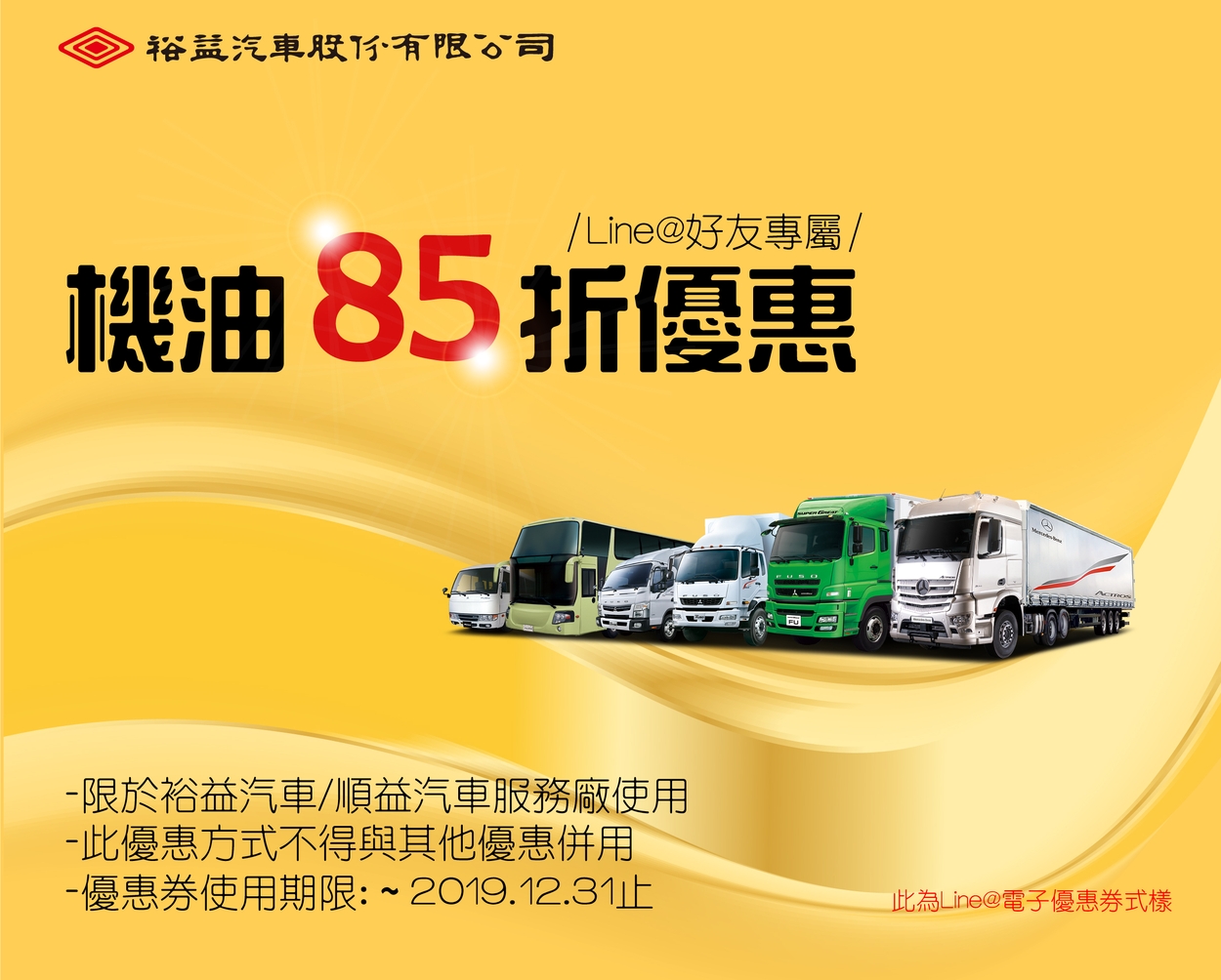 (4)優惠券使用方式:客戶使用時出示裕益汽車LINE@好友專屬之電子優惠券,即可於裕益汽車 / 順益汽車服務廠獲得機油85折優惠乙次;客戶使用後,由服務廠將該張電子優惠券予以註銷。