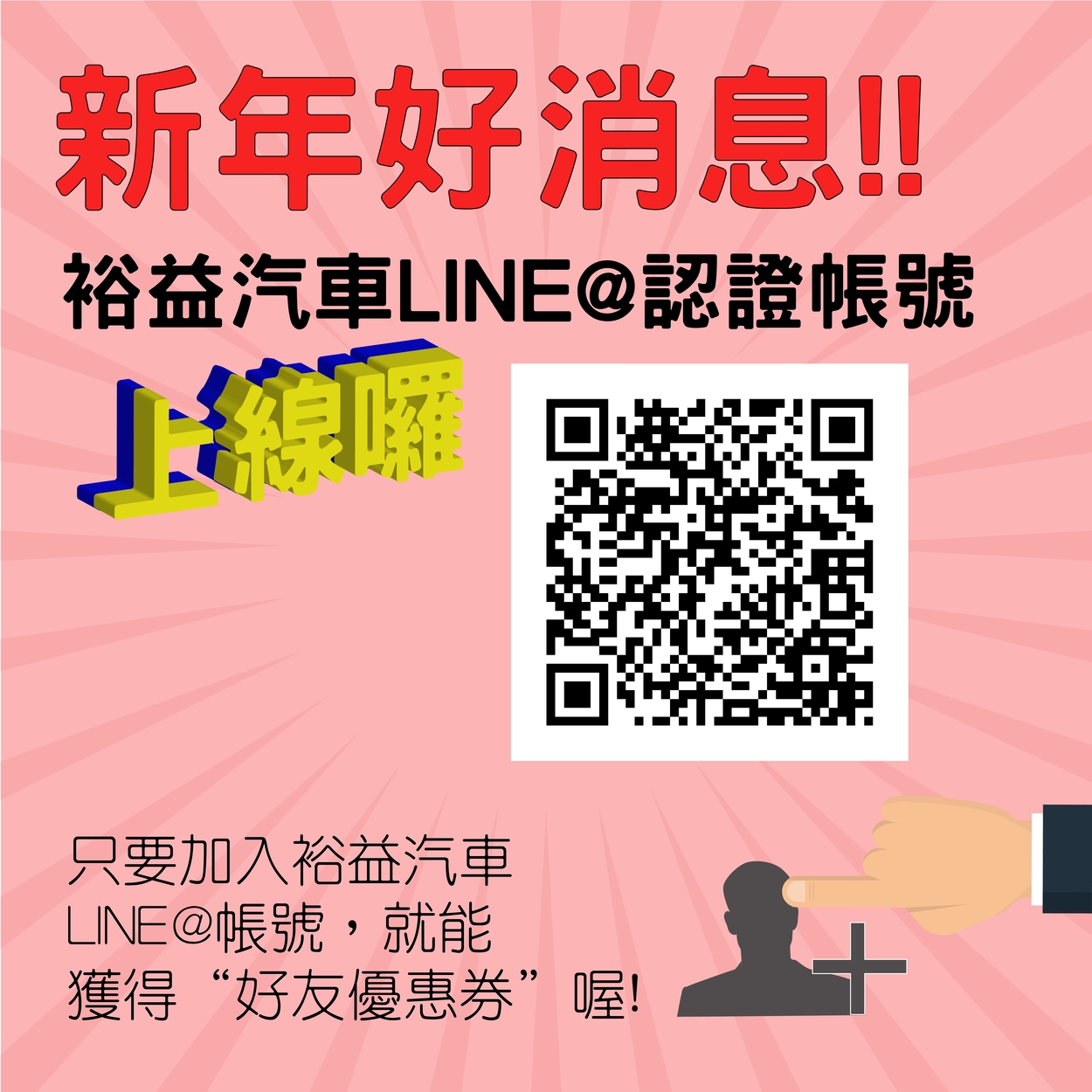 (2)優惠內容:凡活動期間加入裕益汽車LINE@帳號為好友,即可獲得好友專屬【機油85折券乙張】電子優惠券。